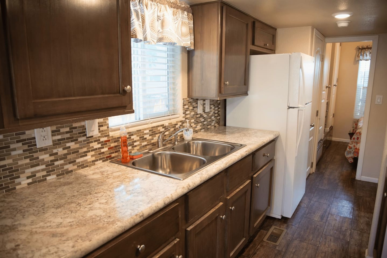 August 2025 5.00Fun ‘tiny home’ with loft. The loft is enough to sleep and that’s about it. May be fun for younger kids. Bedroom and bathroom are good size. Full Kitchen and counter top space is great. Nice cozy feeling highly recommend.